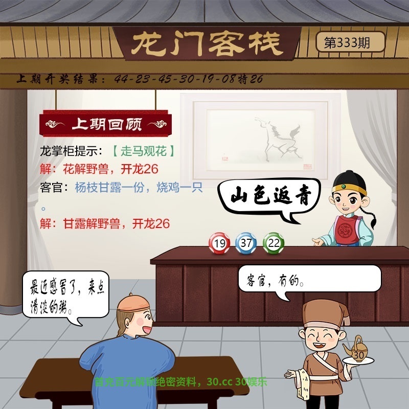 第332期掌柜:走馬觀花 解:意思是骑在奔跑的马上看花 小二:客官,和女朋友一起啊 解:无 客官:杨枝甘露一份,烧鸡一只 解:烧鸡解家禽的生肖牛、马、羊、鸡、狗、猪 推荐九肖:鸡马虎猴狗猪牛龙蛇 |